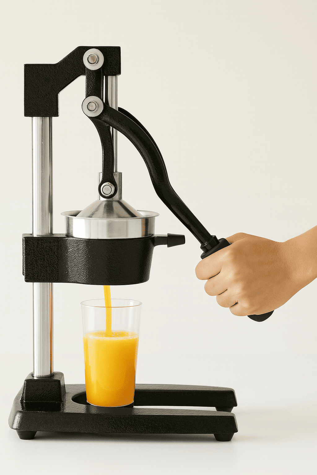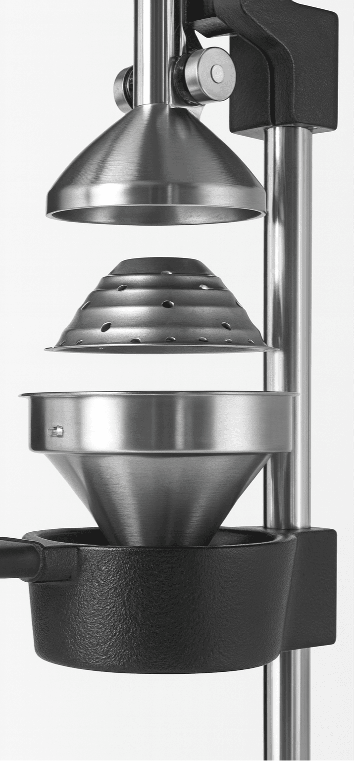 This stainless steel citrus juicer is designed with detachable parts for easy cleaning and professional-grade performance. The large 5-inch pressure cap applies even force with its generous 4-inch press bowl, ensuring maximum juice extraction. A heavy-duty strainer filters out seeds and pits, while the precision funnel directs every drop of juice efficiently into your glass. With its sleek, durable design, this juicer is perfect for both professional kitchens and at-home use, combining convenience, quality, and simplicity.